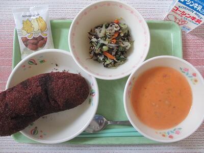 6月27日 牛乳 ココア揚げパン キャロットポタージュ ひじきと青大豆のサラダ スナックアーモンド