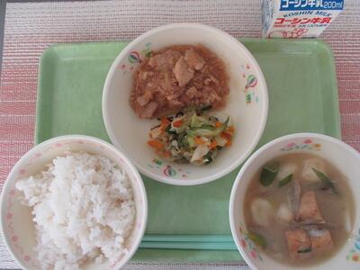 9月11日 牛乳 ご飯 豚肉の生姜炒め キャベツの昆布和え 芋団子の味噌汁(いものおづけばっと)