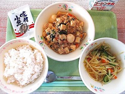 10月16日 牛乳 麦ご飯 うずらの卵と豆腐の中華煮 もやしのカレーサラダ 味付け小魚