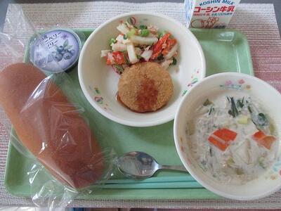 11月18日 牛乳 米粉パン 柏幻霜 ポークメンチカツ(ソース) なないろサラダ(ツナ入り ) かぶとねぎのクリームスープ 柏のブルーベリーゼリー