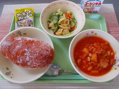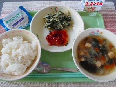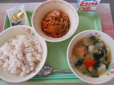 韓国には鱈のスープ(テグタン)があります。テグタンは鱈を丸ごと野菜と煮込み,にんにくや生姜,唐辛子を加えた辛いスープのことを言います。給食では,鱈の身を使用し,唐辛子の入っていないマイルドなスープになっています。豚キムチと交互に食べると,テグタンの味に近づくかもしれません。