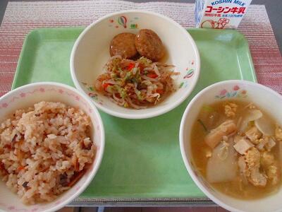 11月25日 牛乳 鶏五目ご飯 レバー入りつくね(2個) 白菜のおかか和え 卵入り味噌汁