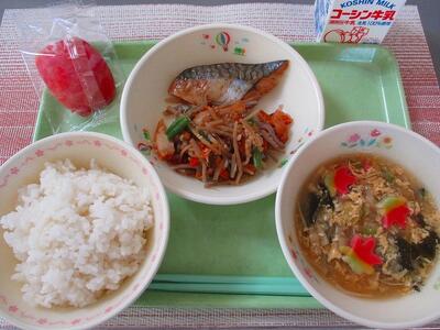 11月22日 牛乳 ご飯 鯖のゆず味噌煮 きんぴらごぼう もみじ生麩 とかんぴょうの卵とじ汁 りんご