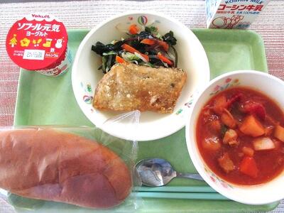 12月12日 牛乳 さつまいもパン たらの洋風竜田揚げ 海藻サラダ ボルシチ ヨーグルト