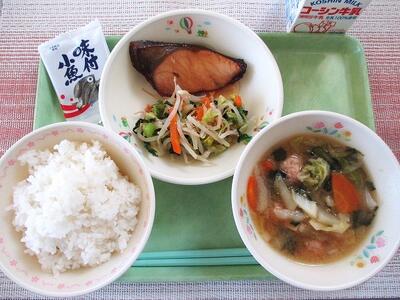 12月16日 牛乳 ご飯 ぶりの照り焼き 野菜のごま和え 鶏つくねの味噌汁 味付け小魚