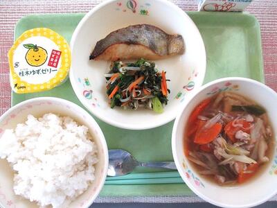 12月18日 牛乳 ご飯 白身魚の西京焼き 磯香和え せんべい汁 国産ゆずゼリー