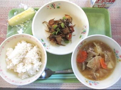 12月19日 牛乳 ご飯 チキンチキンごぼう 呉汁 りんご