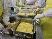 薄焼き卵は一枚ずつ調理員さんがはがしてからたたんでいます。