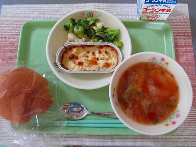 3月11日 牛乳 胚芽パン ベーコンポテトグラタン 花野菜サラダ ラビオリ入りトマトスープ