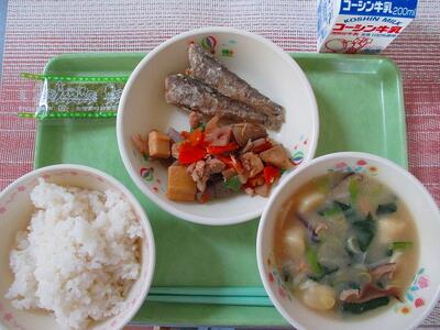3月12日 牛乳 ご飯 味付けのり めひかりの唐揚げ(2本) 炒り鶏 芋団子の味噌汁
