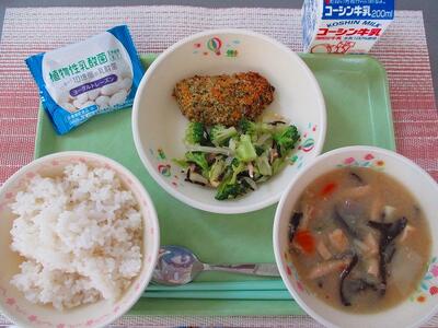 3月17日 牛乳 ご飯 鰺のチーズパン粉焼き ハムとひじきの和え物 高野豆腐のごま仕立て味噌汁 ヨーグルトレーズン