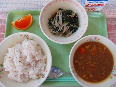 3月21日 牛乳 麦ご飯 ポークカレー ツナとわかめのサラダ 清見オレンジ