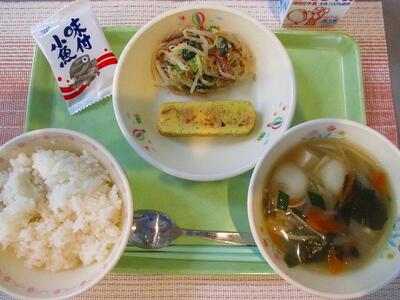 3月19日 牛乳 ご飯 具だくさん 卵焼き ・ ぜんまいのナムル 水餃子と竹の子のスープ 味付け小魚