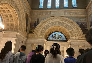 中央広間を上から見学しました。窓や天井には、ステンドグラスがはめこまれていて、とても重厚な感じがしました。