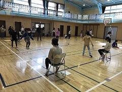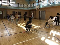 大津一小には、「ジンギスカン」の音楽に合わせたリズム跳びもあります。体育委員の演技に合わせて、みんなで「ジンギスカン」の準備運動をして始めます。
