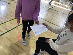 体育委員会が「なわとび検定」を行っています。昼休みを使って、毎日2学年ずつ、検定表に沿って、できた項目にシールを貼ります。跳躍跳び、あや跳び、二重跳びなど、自分の力に合わせて、体育委員が審査してくれます。