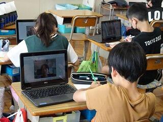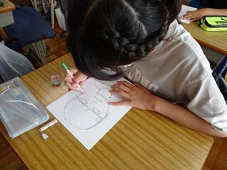5年生が図工の時間に、端末で自分の顔を撮影して描いていました。