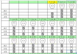また、定期的に歯科を受診することも、健康な歯を維持するためにとても大切なことです。特に歯科検診で受診勧告を配付されたお子さんは、夏休み期間中に歯科を受診することをお勧めします。夏休み明け、健康な歯で笑顔いっぱいの皆さんに会える日を心待ちにしています!  (養護教諭 岡田)