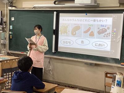 3年生の皆さんと、排便習慣について学習しました。心も体も元気にすごすためには、毎日の排便でお腹をスッキリさせることがかかせません。そのためには、よくかむことや、野菜・いも・豆などもとりいれたバランスの良い食生活、早寝・早起きの生活リズムが大切なポイントです。朝は余裕を持って起きて、毎朝の排便習慣をつくりましょう!