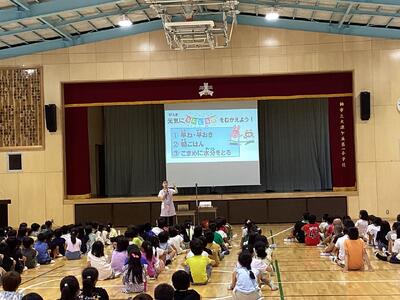さて、今日の始業式では、運動会に向けて熱中症についてお話をしました。夏休みの期間で、生活リズムが崩れていたり、体が冷房のある場所で慣れていたりすることもあるかもしれません。1年に1度の運動会の日を元気にむかえるためにも、「早寝・早起き・朝ごはん」の生活リズムをつくって暑さに負けない体づくりをすること、そして、こまめに水分補給ができるよう毎日の水筒準備のご協力もよろしくお願いいたします。 (養護教諭 岡田)