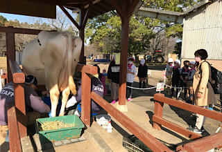 3年校外学習26 投稿日時 : 2021/11/29 大津ヶ丘第一小学校管理者 まず、指でOKのマークを作り、牛の乳の根元にあてます。次に中指から順番に指をおろしながら握ると牛乳が出てきます。練習しているところです。