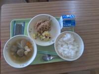 今日の給食は、豚肉と切り干し大根の炒めに、さつまいもの和物、鰯のつみれ汁、ご飯、牛乳、味付け海苔です。