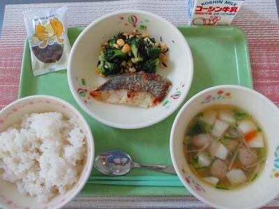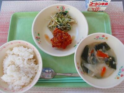 3月5日 牛乳 ご飯 鯖のゆず味噌煮 磯香和え けんちん汁 いちご(2粒)