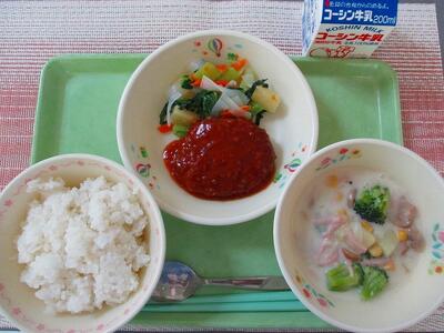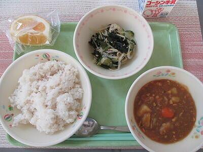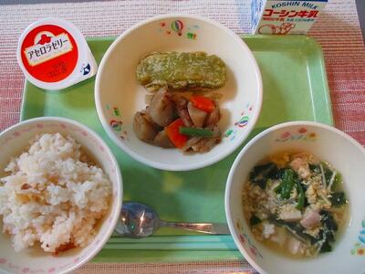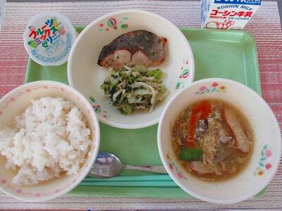 今日は6年生の卒業を祝って,お祝いには欠かせない「赤飯」と,リクエストのあった「ハンバーグ」,デザートには「お祝いいちごゼリー」です。6年生にとっては,お世話になった先生やクラスの仲間と一緒に食べる給食は今日が最後です。楽しい給食の時間を過ごしてくださいね。そして,中学校でも元気に頑張ってください。ご卒業おめでとうございます!