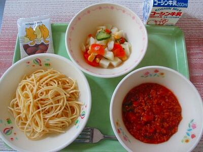 3月6日 牛乳 ミートソーススパゲティ(スパゲティ) じゃが芋と青菜のサラダ 洋梨タルト