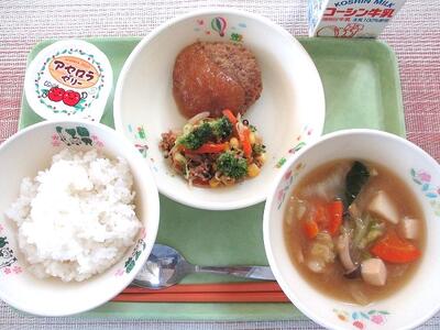 大津ケ丘中学校の2年生が考えた献立です。栄養バランスを大切にして,いろいろな食品を取り入れ,彩りについても考えました。ハンバーグを好きな人が多いので,魚を使った和風のハンバーグにしました。毎日の給食の献立も,栄養バランスだけではなくいろいろなことに気をつけて考えています。美味しく食べてもらえたら嬉しいです。