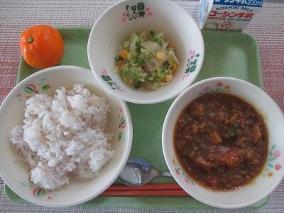 12月9日 麦ご飯 冬のポークカレー こんにゃく入りサラダ みかん