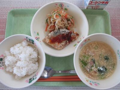 12月10日 牛乳 ご飯 鯖のヤンニョムソース バンサンスウ 中華卵コーンスープ