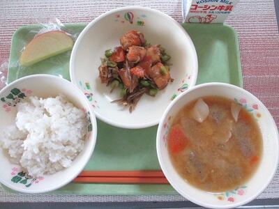 12月11日 ご飯 チキンチキンごぼう 呉汁 りんご