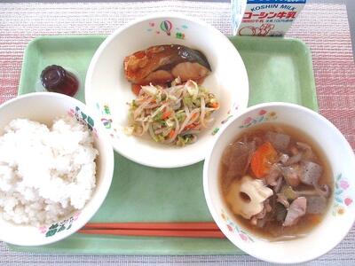 いなだは大きくなると鰤と呼び,成長するにつれて名前が変わる「出世魚 」で縁起が良いと言われていて,お正月に食べる地域があります。ちくわぶは,関東地方を中心とした東日本で「おでんの具 」として入ることの多い食材です。今日は根菜汁に,薄く切ったちくわぶが入っています。最近はデザートとして食べることもあるようです。