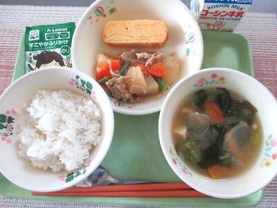 12月16日 牛乳 ご飯 のりふりかけ 厚焼き卵 肉じゃが 柏大根の味噌汁