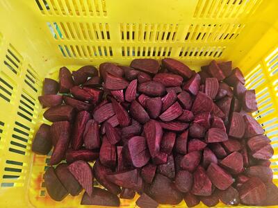 ボルシチは,ウクライナから伝わった家庭料理として他の国でも食べられています。「ビーツ」という鮮やかな赤い色のかぶのような野菜が入っているのが特徴です。見た目は大根やかぶに似ていますが,ほうれん草と同じ仲間です。今日は柏でとれたビーツとかぶも入っています。