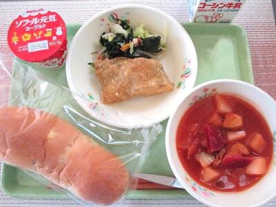 12月17日 牛乳 さつまいもパン たらの洋風竜田揚げ 海藻サラダ(青じそドレッシング) ボルシチ ヨーグルト