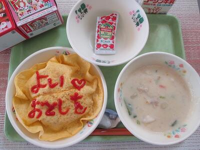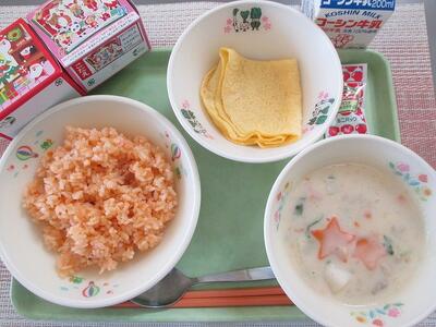 オムライスはフランス語の「オムレツ」と英語の「ライス」を組み合わせてできた日本生まれの洋食です。今は卵がとろっとしているオムライスもありますが,もとは今日の給食のように薄い卵をで包んで食べていたようです。柏かぶのポタージュの中には、秋谷さんが育ててくれたかぶがたっぷり入っています。ラッキー人参も入っているかもしれません。楽しく食べてもらえたら嬉しいです。2学期もありがとうございました。来年もよろしくお願いします。