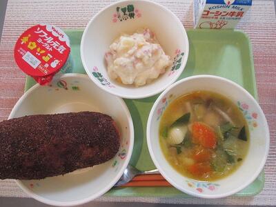 2月10日 牛乳 ココア揚げパン じゃが芋のチーズ煮 肉団子と野菜のスープ ヨーグルト
