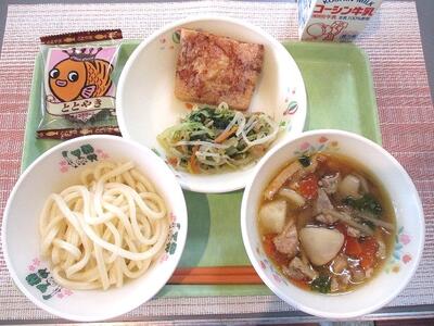 2月13日 牛乳 けんちんうどん(うどん) 焼き信田(具入りいなり) ツナ和え ミニたい焼き(チョコレートクリーム)