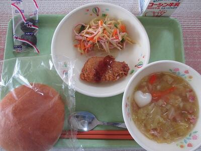 2月17日 牛乳 丸パン(横スライス) 鯵のクリームチーズつつみフライ(ソース) もやしのカレー風味サラダ キャベツとベーコンのスープ ドライプルーン