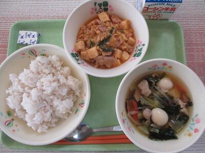 2月18日 牛乳 麦ご飯 チゲ豆腐丼の具 鶏肉と野菜の五目スープ ベビーチーズ