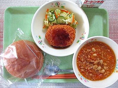 3月2日 牛乳 丸パン(横スライス) 野菜コロッケ(ソース) 春キャベツのサラダ チリコンカン