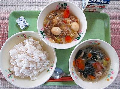 3月4日 牛乳 麦ご飯 中華丼の具 春雨スープ ベビーチーズ
