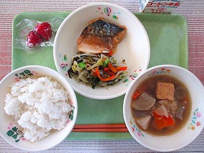 3月5日 牛乳 ご飯 鯖のゆず味噌煮 磯香和え けんちん汁 いちご(2粒)