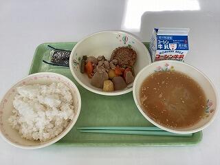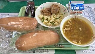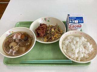 二小ちゃんたちも大好きな「から揚げ」がおかずのメインです興奮・ヤッター!給食センターで特製のタレにつけた後に,衣をつけてから油で1つ1つ手作業で揚げています。(右大津一小の給食ページ)調理員さんたちの愛情に感謝ですハートすいとんがたっぷり入った汁物と,ごぼうとコーンがたっぷりの和え物も美味しかったです花丸