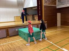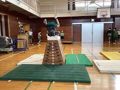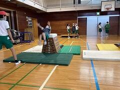 5年生が体育で台上前転を練習していました。高い跳び箱でも成功しているニコちゃんもいました。
