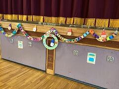なかなか届かないプレゼントを静かに待っていた1年生。放送委員のお姉さんからのプレゼントに拍手喝采!!プレゼントは,スピーカーにつける手作りの飾りです。クラスによって,いろいろな模様になっていました。ありがとう!!放送委員会のみなさん