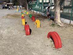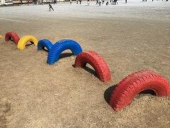 用務員の竹内さんが,校庭のタイヤにペンキ塗りをしてくれたおかげで,ピカピカになりました。新しくなった(ように見える)タイヤで楽しく遊んでいます。