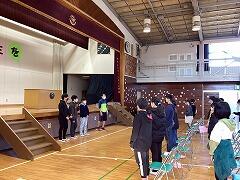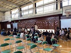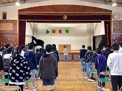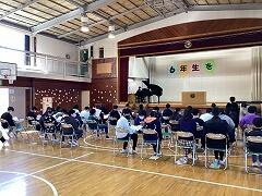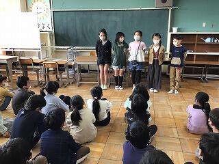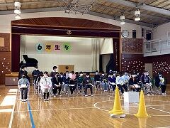 6年生にとっては,下の学年の友達に見てもらうことで本番に近い緊張感をもつこと,5年生にとっては,1年後の姿をイメージすることが目的です。5年生は,次の学校全体のリーダーとしての自覚を持つこともねらいとしています。